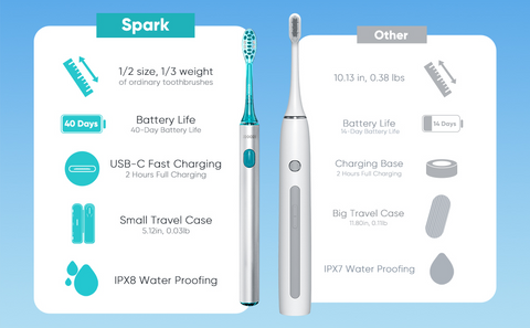 Infinite Portability Structure: Spark adopts aluminum alloy material, with a volume of only 1/2 of a regular electric toothbrush and a weight of only 60g. Equipped with a travel lanyard, it is convenient to carry and suitable for everyone to use during the journey.