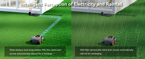 Automatic Charging: Equipped with a large battery, this robot lawn mower provides 70 minutes of efficient mowing time per charge. If the battery is below 15%, it automatically returns to charge, resuming work immediately after reaching 90%. Even in the rain, it will automatically return to the charging station. You can delay the mowing time through the app until the rain stops and the lawn is dry enough.