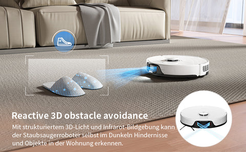 【Smart Intelligence】Equipped with Texture Light 3D obstacle detection—utilizing patterns projected onto the scene and deforming patterns to accurately detect obstacles, making the S8 robot vacuum think smarter and work faster and easier than ever before.